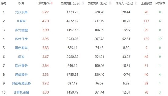 板块方面,光伏设备、IT服务、多元金融等板块涨幅居前,银行板块下跌。